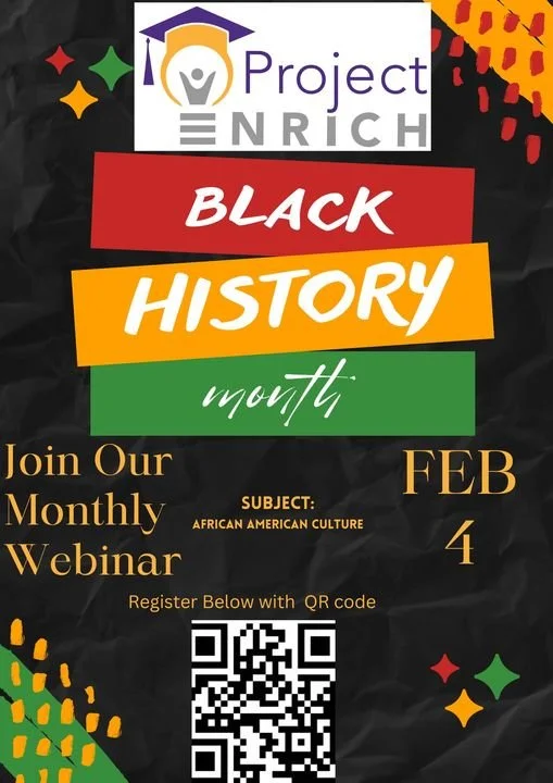 Project Enrich will have our 5th session of the year on February 4th at 9:15 am. This is the premier college preparatory program built for all high school students. We invite all high school students who are interested in participating in this program to sign up using the QR code or this link https://www.projectenrich.org/registration.html .